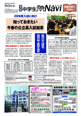 信濃毎日新聞社は9月5日、中学生のための進路情報紙「信毎中学生Navi(中ナビ)」第76号(9月号)を発行しました=画像。同日に県内全中学校に届けられ、校内で2・3年生や教職員らに配布されます。