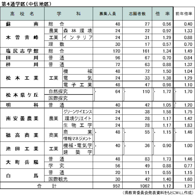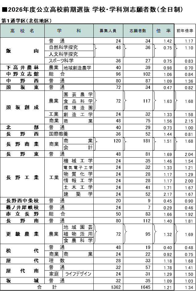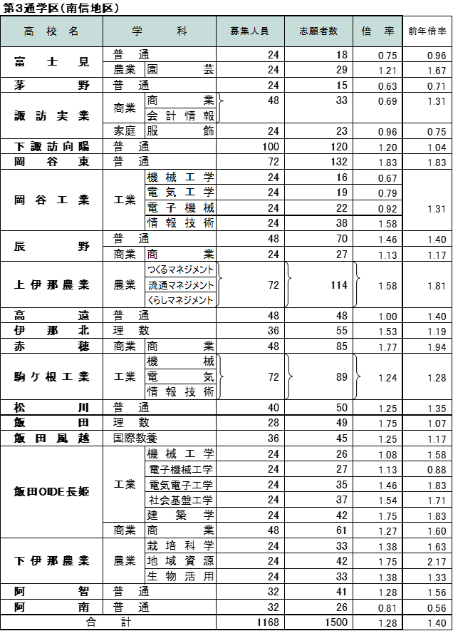 全日制の志願状況を学校(学科)別にまとめたのが下の表です。志願者が募集人員を下回ったのは32学科に上り、昨年より8学科増えました。高倍率になったのは、小諸義塾・普通2.27倍、長野工業・建築2.17倍、上田染谷丘・国際教養1.97倍、上田千曲・食物栄養1.96倍、岡谷東・普通1.83倍-などです。合格発表は18日。