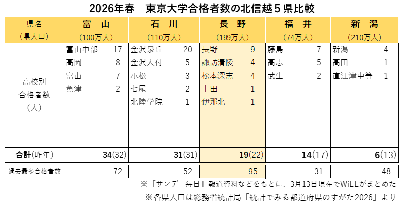 この結果、北信越5県の中ではトップ富山県の34人、2位の石川県31人に次いで3番目となり、昨年と同順位でした=表。しかし、人口規模の面からみると、県勢は富山、石川両県に依然として順位以上に水を空けられている状況です。
