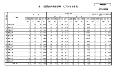 厚生労働省はこのほど、第111回薬剤師国家試験の合格者を発表しました。全国で1万2774人が受験し合格者は8749人、合格率は68.49%(前回68.85%)でした。大学別で最も合格率が高かったのは金沢大学(石川県)の94.87%、以下、岐阜医療科学大学(岐阜県)94.00%、国際医療福祉大学福岡薬学部(福岡県)93.15%、名城大学(愛知県)92.28%が続きました。